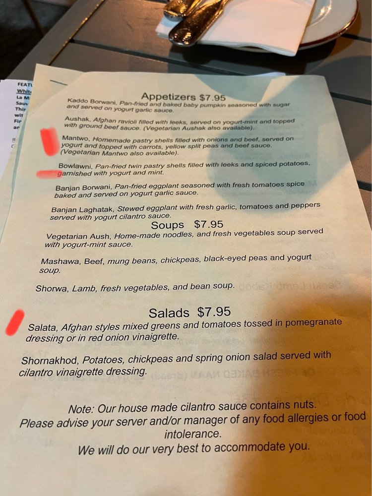 Afghan ravioli filled with leeks, served on minted yogurt and topped with yellow split peas and carrot sauce. Served with pallow.